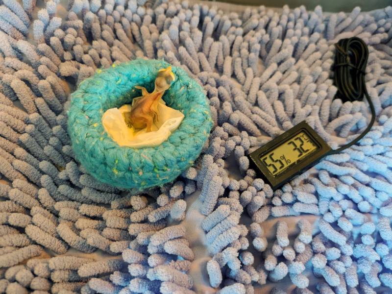 Zunächst wird der aufgeladene Taschenwärmer in einen Nestersatz gelegt, eine aufgerollte Wollsocke als eigentliches Nest darauf gestellt und außen herum ein befeuchtetes Tuch gewickelt. Temperatur und Luftfeuchtigkeit werden kontrolliert und anschließend das Ganze mit einem leichten, luftdurchlässigen Tuch abgedeckt.
